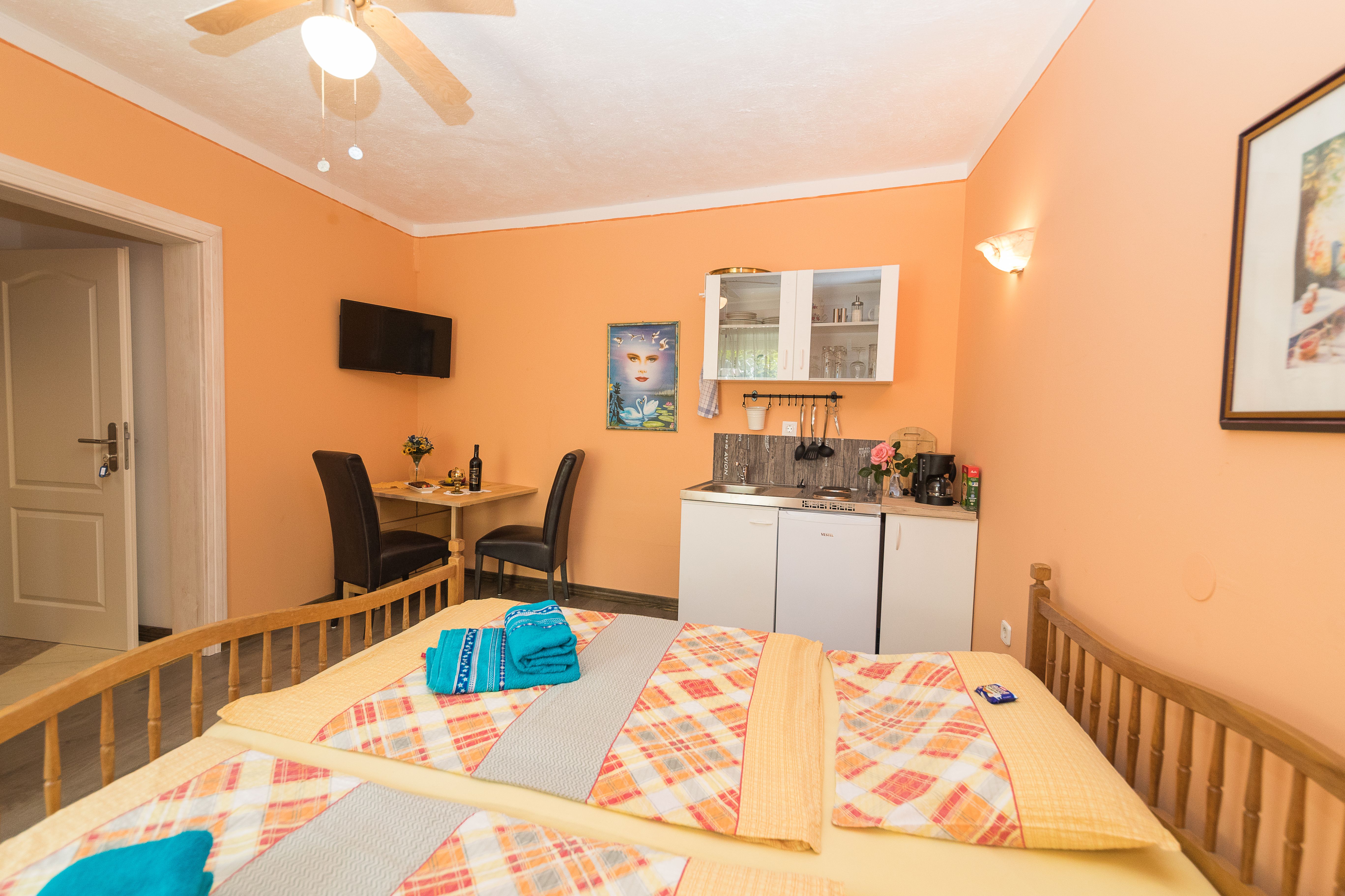 Das Neue „Adria Studio Appartement“ ist ca. 35 qm groß und verfügt über ein großzügiges Bad, eine Mini Küche mit 2 Platten Herd ( normale Größe),Spülbecken, Kühlschrank, Wasserkocher, Töpfe, Pfannen und allen benötigten Küchenutensilien.